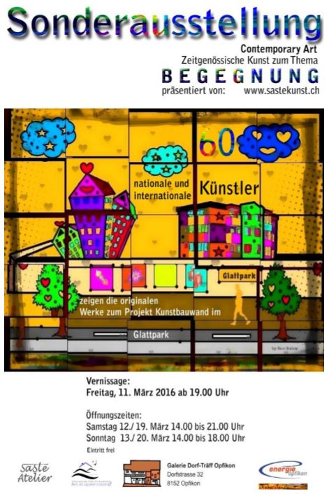 ab Ende Februar ziert eines meiner Werke, als Blache gedruckt, die Bauwand des Glattparks in Opfikon. Paralell dazu wird das Originalbild in der Galerie Dorf-Träff vom 11. bis 20. März ausgestellt.